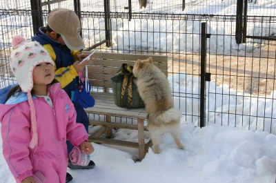 前回遊びに来てくれた時は芝の上、今回は一面雪です。